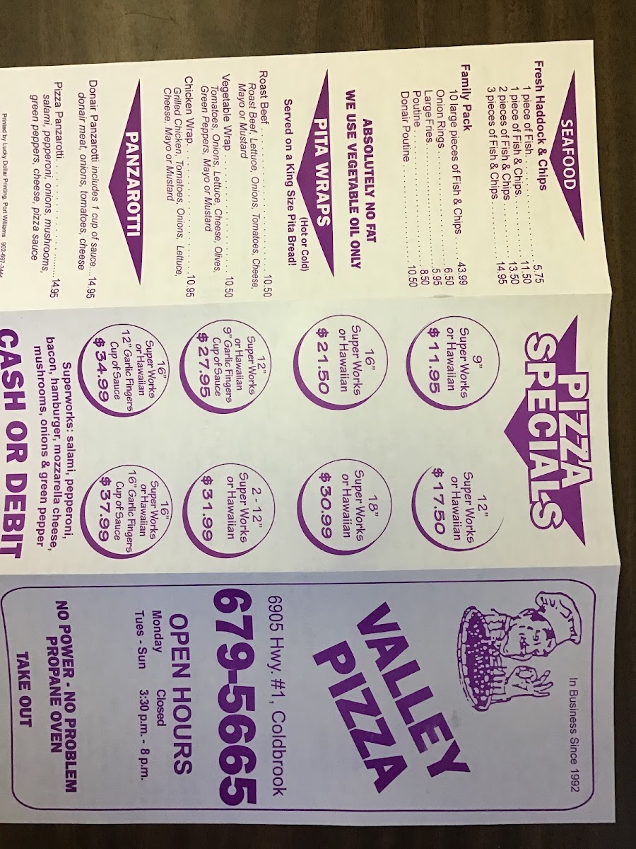 Valley Pizza Restaurant offers a diverse and satisfying menu that caters to various tastes. For seafood lovers, the Fresh Haddock & Chips is a classic choice, delivering crispy, golden fish paired with perfectly fried chips. The pita wraps section features options like the savory Roast Beef Wrap and the light and fresh Vegetable Wrap, perfect for those seeking a lighter meal. If you're craving something heartier, the restaurant offers several pizza options such as the Chicken, Super Works, and Hawaiian Vegetarian pizzas, each crafted with fresh ingredients and generous toppings. The Donair is another popular option, offering a delicious twist on traditional flavors. Whether you're in the mood for seafood, a wrap, or a hearty pizza, Valley Pizza Restaurant has something for everyone to enjoy.